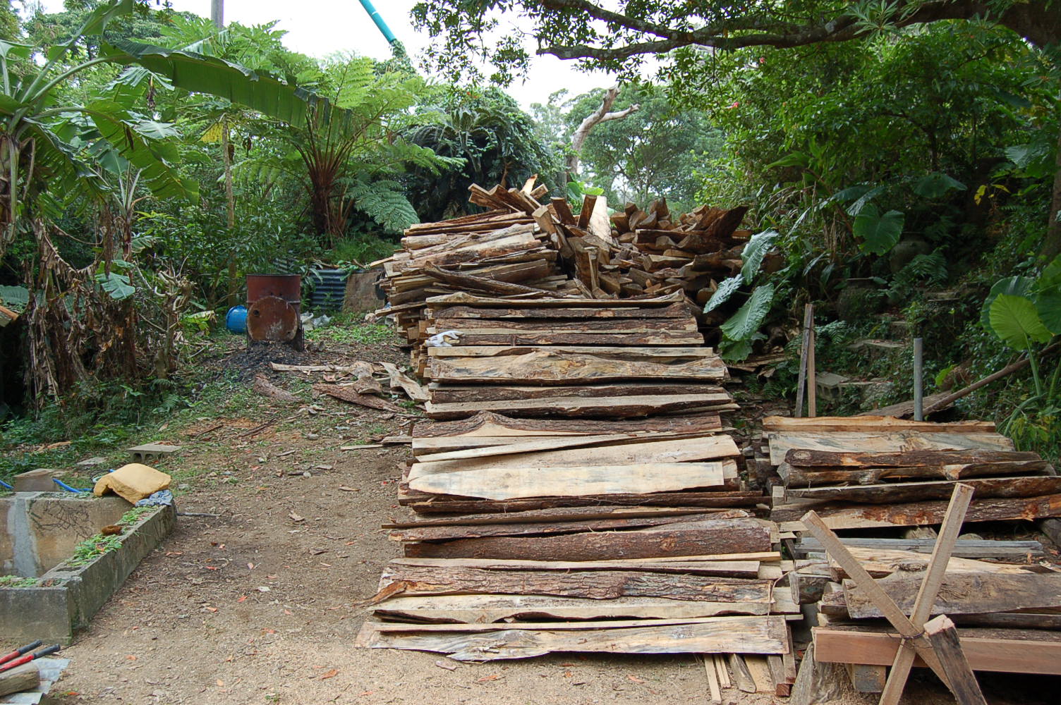 からしか陶土作りができないため、相棒のF氏とヤンバルの森林組合まで息抜きを兼ねドライブ。前回の窯焚きと同じ10束を運搬して貰う。