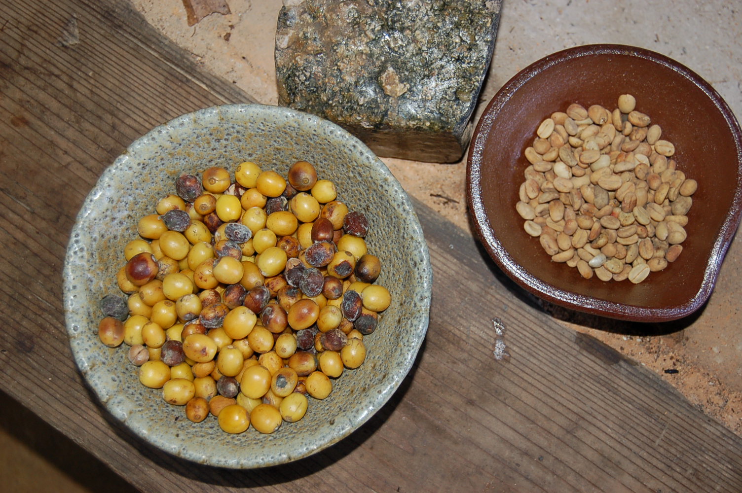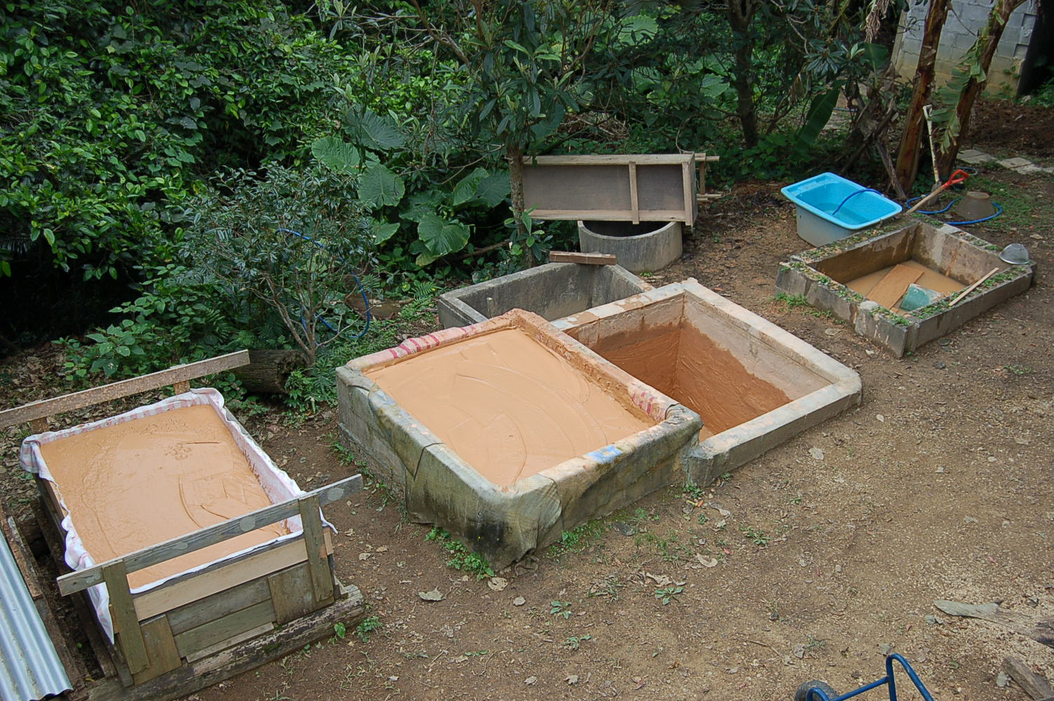 早速陶土作りから始めようとしたが、原土を入れ水と攪拌するブロック槽にひび割れがあり、セメントで埋め合わせる。セメンが固まる翌日