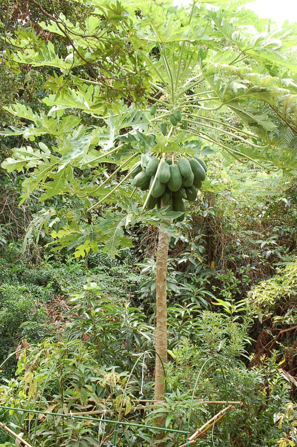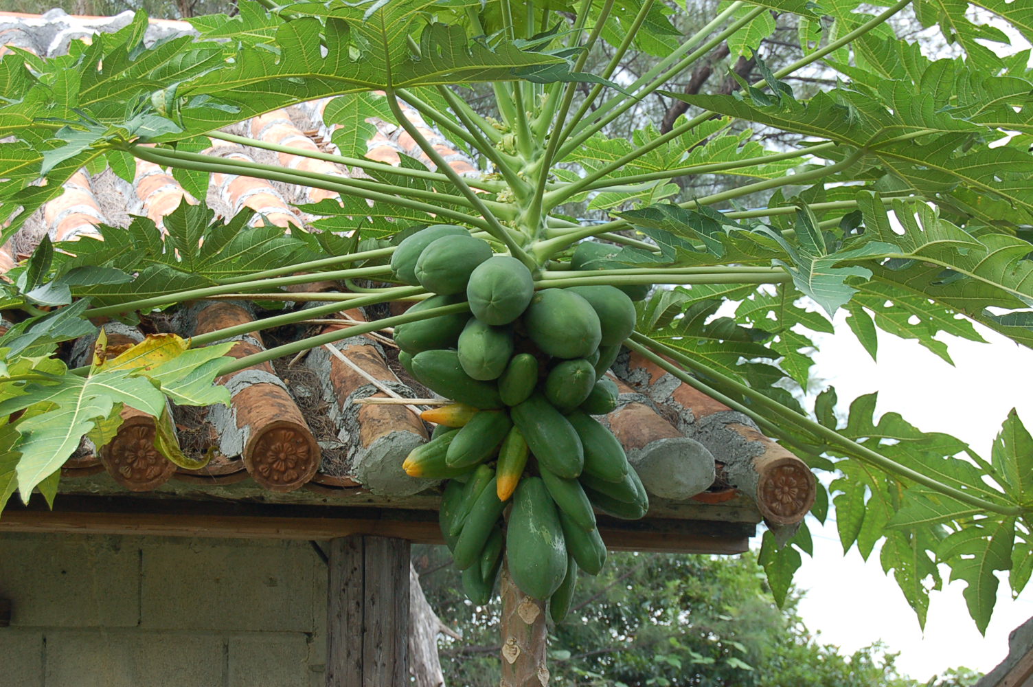 台風が沖縄に接近、今年はまだ直撃を受けていない。5mに達したパパイヤの木は、玉汗を噴出すかのように、1本の木に