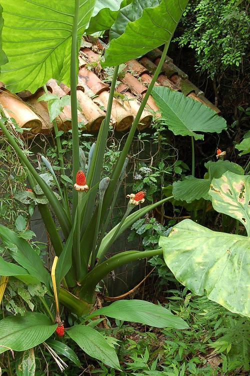 ヒカゲヘゴの葉っぱの間から、顔を出したノボタン。囲炉裏、自在に吊り下がったヤカン。