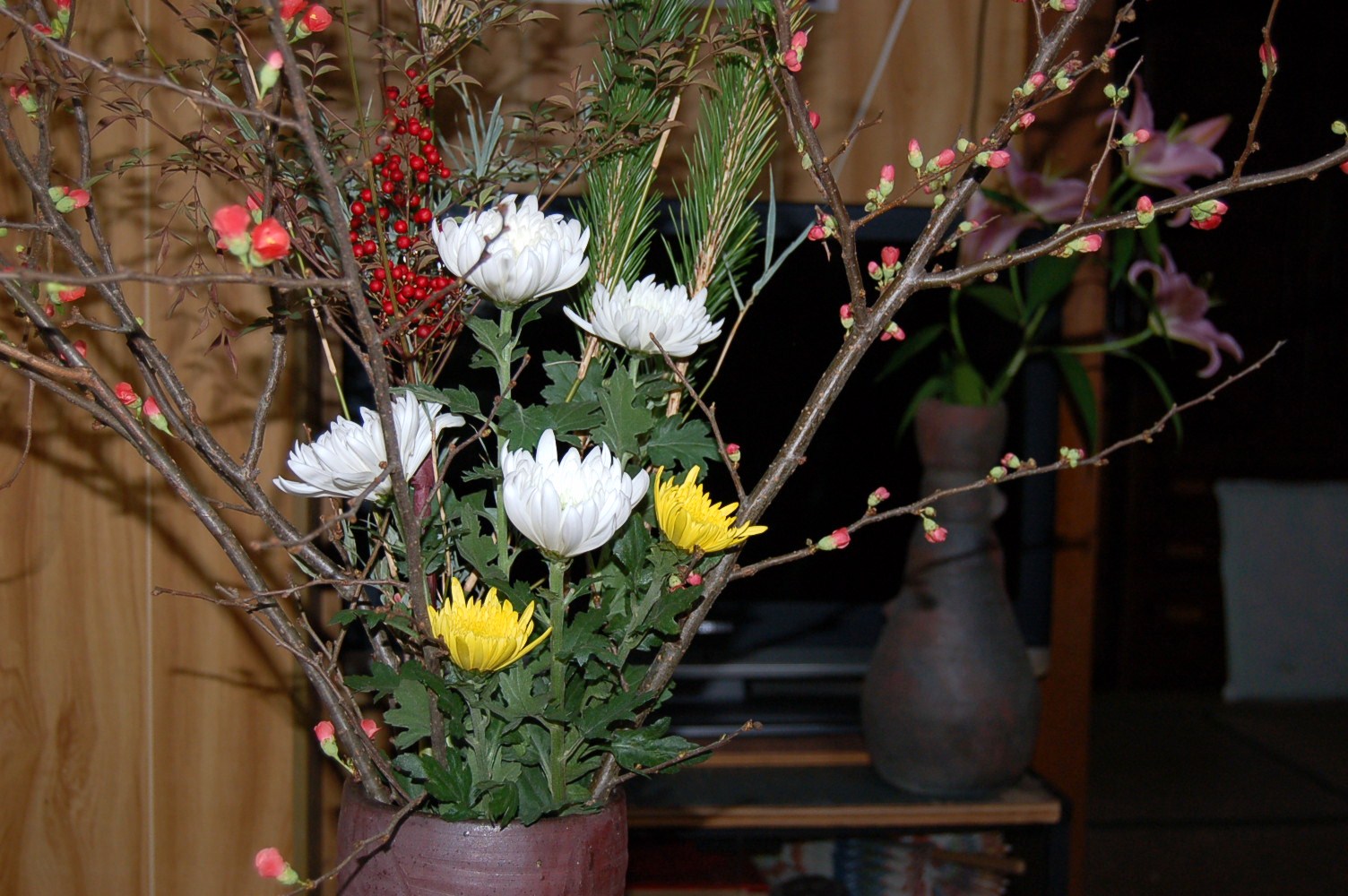 いる梅の枝、松、南天、竹、菊を見定め引っこ抜き女店長に渡す。陳列された盛花より、安いであろうとの算段で