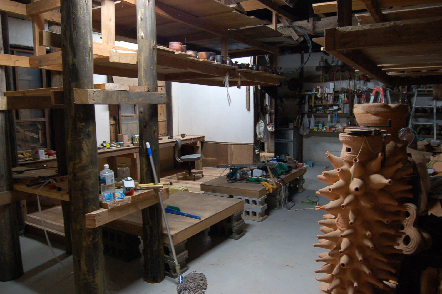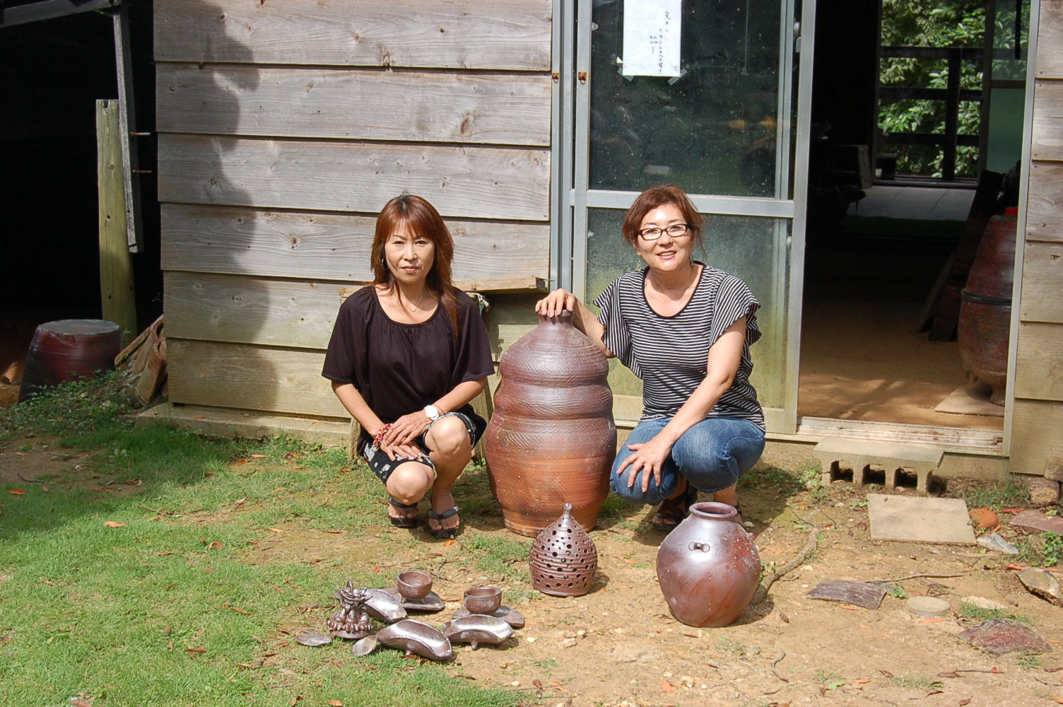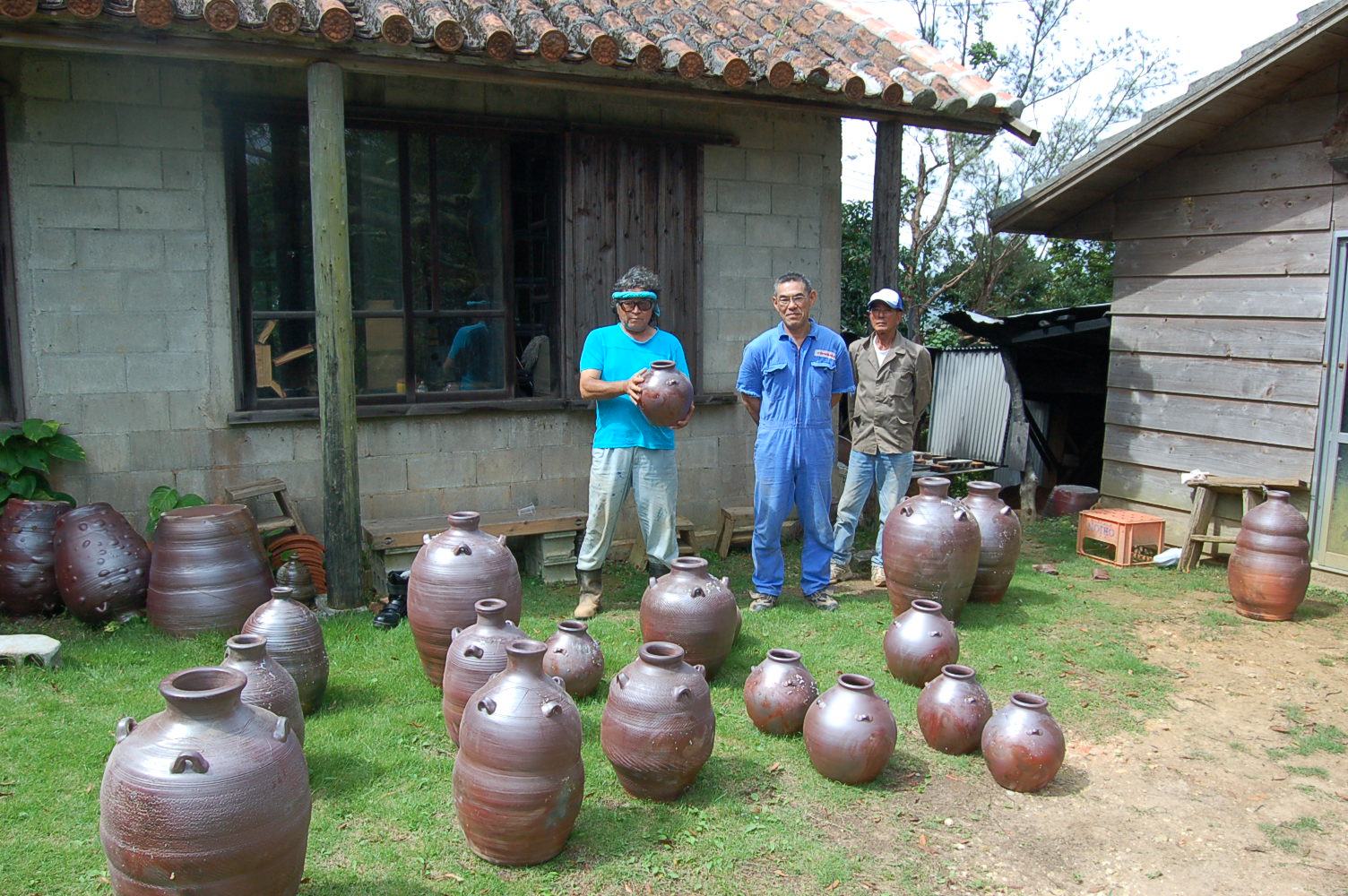 6/6 焼き物(陶器)には、一般に柚薬を掻ける上焼きと、無柚の焼き〆(南蛮焼き)がある。小生は、後者の南蛮焼き、穴窯で焼成している。 縄文土器に魅了されてから、そこからまだ抜け出せないでいる。3/11以降価値観が変わった。作品作りにおいては、創る意義を見いだせず、 意欲が無くなっていた。縄文土器を追う姿勢はかわっていない。逆に強くなった。この歳に及んで、表現する素材の土が、このところ、 薪窯では、体力的に負担を大きく感ずるようになった。表現する事に関しては、まだしも、これまでやってきた、素材の土において十分に 具現化しているとは、おもえないが、ここにきて体力的な、リスクの大きさを感ぜずにはいられない。体力的に負担のかからない小物の制作や、 電気窯での焼成も考えている。あるいは、別の表現方法も、ジャンルは問わず、制作の全行程を負担無く試みることが、できる素材。 4交代6時間で窯を炊く。9時からPM3時までは毎日ウルマ市のシルバー人材センターの人に入ってもらい、後の時間を3人で割り振りし、時間割 を決め順繰りに従来道理に交代で窯焚きをした。最初のスタート時の温度は100度C内で一日を終え、2日目から200度Cから300度Cに温度を 徐々にあげ、4日目間その温度で引っ張っていく。低温度で引っ張っても窯は熱くなっていく、今回も古酒壺なのだが、2年ぶりの窯焚きだ。 窯の構造は両側面は耐火レンガで築いているが、その上の天井はワラを混入した泥でできている。窯はもっとも原始的な構造の穴窯だ。どうして、 こうした非能率的な窯で焼成するのかと言うと、昔ながらの苦労して焼いた証の後味が、実に深みのある味わいとして目にうつるからである。 毎年、失敗したりで、課題がのこる窯焚きなのだが、今回は薪の火力の強さが大きく窯焚きを左右することを改めて強く認識させられた。 これまでの窯焚きで、解っていることなのだが、焚く時間の長さや、労力で補ってきた節があった。そこのところが、毎度の窯焚きで一番 注意しなければいけない、重要ポイントだ。南蛮焼き(荒焼き)は、焼きが作品全てを決めてしまう。作品の良し悪しは窯焚き。そう言う 意味でも焚く薪に注意する必要があるのだ。以前沖縄で個展をしていた内地の窯元が、同じ系統の無柚の焼き〆と言うこともあって、 個展後に訪ねてきた。展示室で話をしながら、窯をみたいとのことで、薪をつんだ窯に降りていった。窯の薪置き場に、松材と雑木が入り 交じって積んであった。しばらく、窯場をじっとみた後、「この薪で、窯焚きをするんですか、1300まで温度が上がるんですか」と、 疑問を呈してきた。そのときはは、「廃材でもなんでも薪にして1300度まで温度をあげ窯を焚いている。」とためらいもなく、言った。 その当時は体力もあり無理しての窯焚きで、一日や二日の延長があっても焚きとうしたのだ。やはり薪は、火力の強い松材のなかでも、 松ヤニの詰まった松で焚くべきである。雑木、廃材では火力は弱い。窯焚きの最後の攻め焚きの追い込みで投入する薪には、どおしても、 火力のある良質の松材がいる。そうでないと、肝心なつめで、予定温度まであげることができないうえ、質の悪いまきでは、温度を下げた うえオキが貯まり、根詰まりとなって、薪の投入度に温度が逆に下がっていく、悪循環となるのだ。それと、あるていど窯焚きの経験をつんだ 焚き人である。昔、壺屋ではヒータチャー(火焚き人)として、職人のように、窯を焚いて回る、専門の窯タチャーもいたようである。 焼成の良し悪しは、この窯焚きによってきまるのだ。 毎回窯焚きにあっては、今回も、まったくの、素人を、つなぎ人として入ってもらうことになった。窯焚きに関してはヤチムンについてある ていどの興味と関心があり、物作りの情熱がなければ窯を焚くことができない。