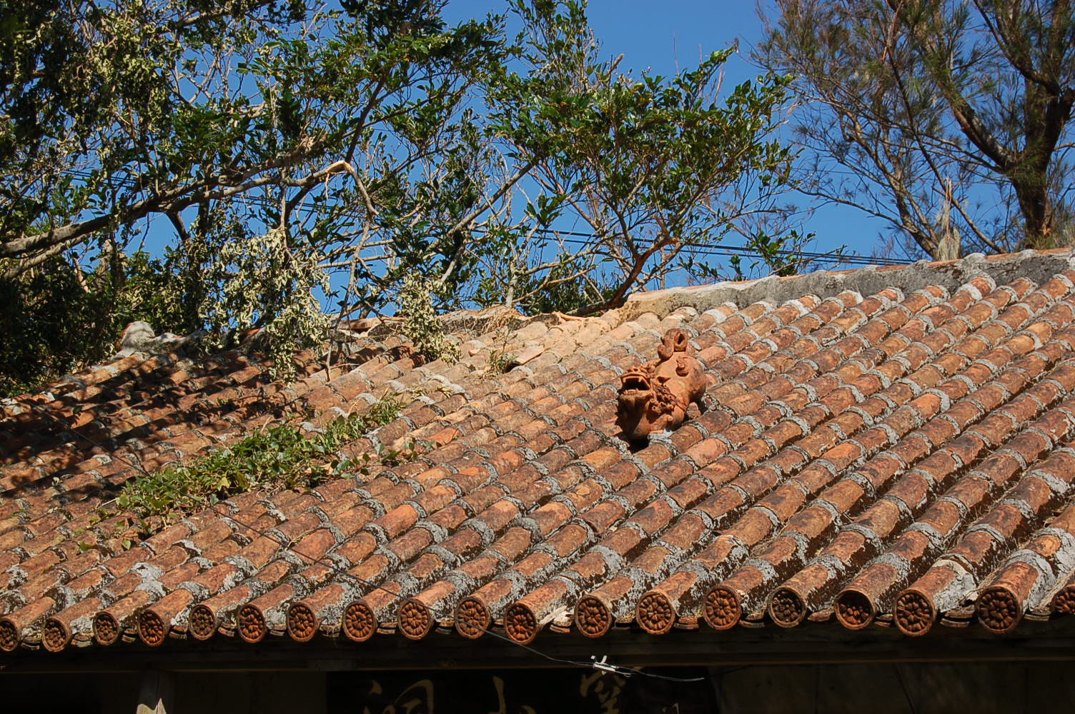 一週間かけてする。工房の赤瓦屋根のてっぺんと、北側の屋根の一部が軒先から剥がれおちたため、まず、軒先の柱を