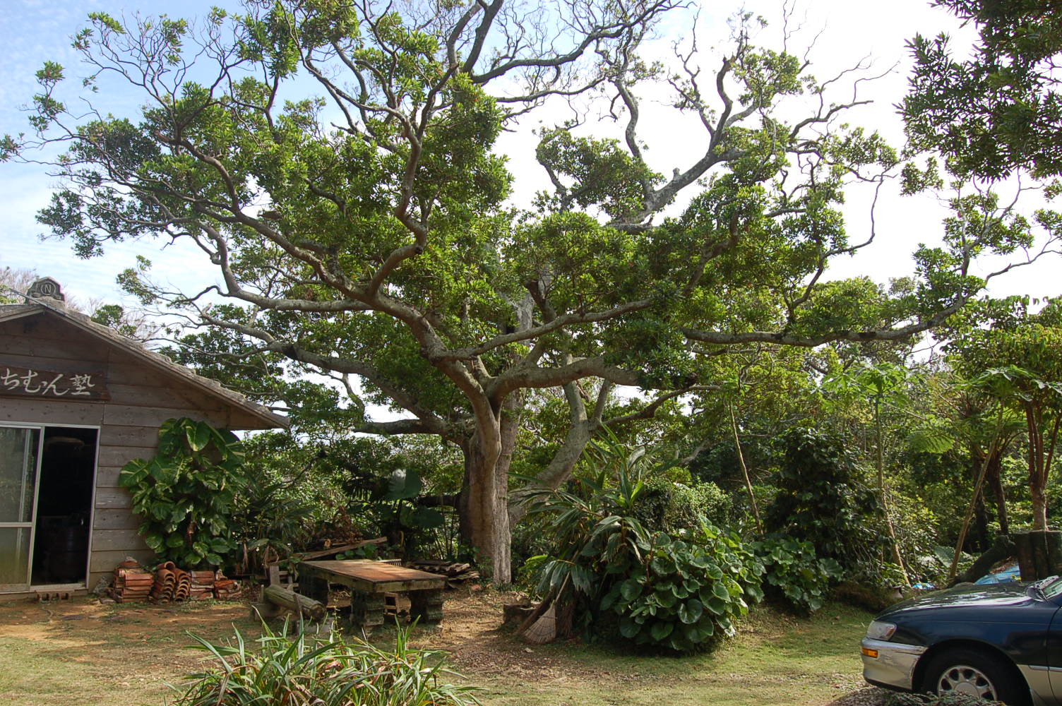 11/17 窯場の中央にホルトノキの大樹が鎮座している。80年〜100年の樹齢の木と思われる。台風の度に枝に被害を受けている。