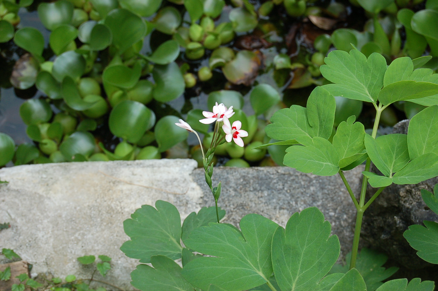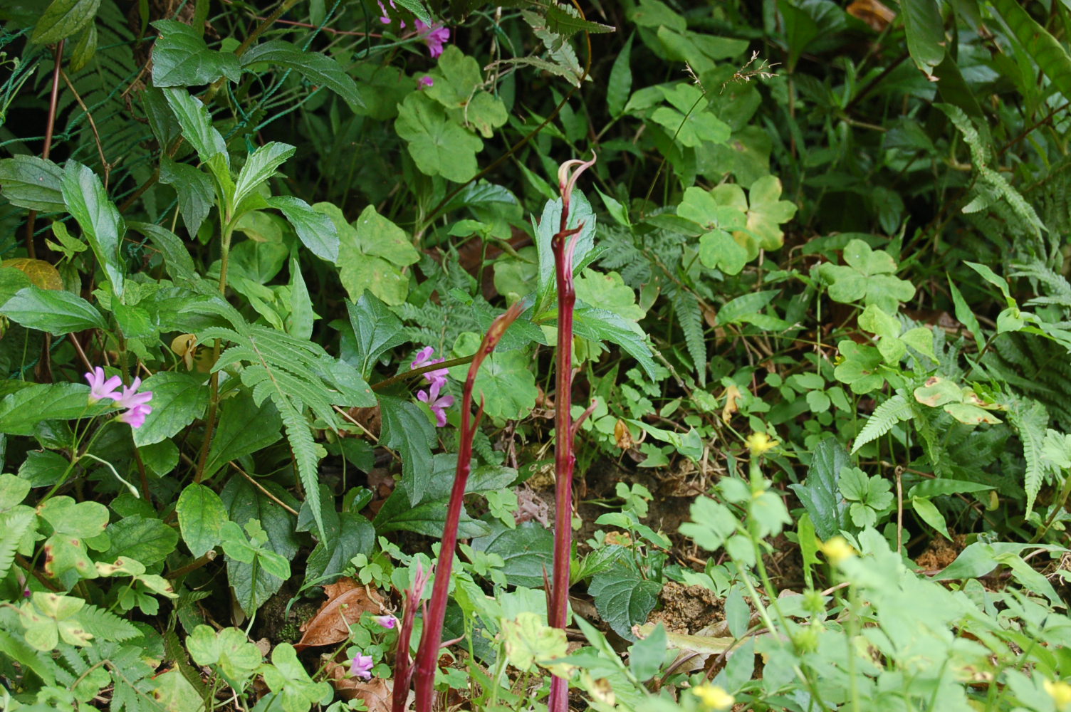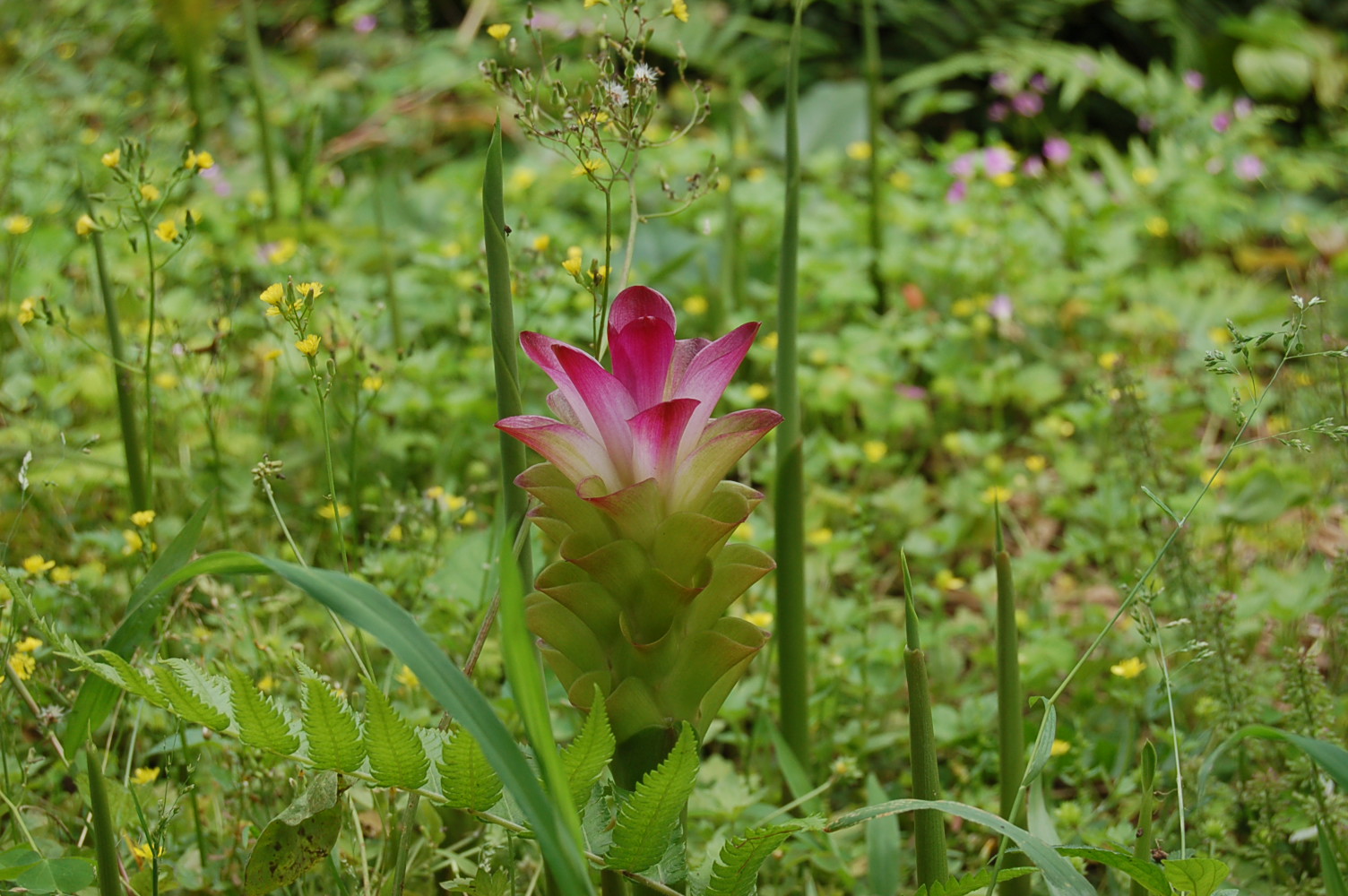 窯場土手に幾本も芽を出したウコンそしてウコンの花、隣の画像は山芋の芽だ。2月の旧正月に掘り起こした後、残り種イモ