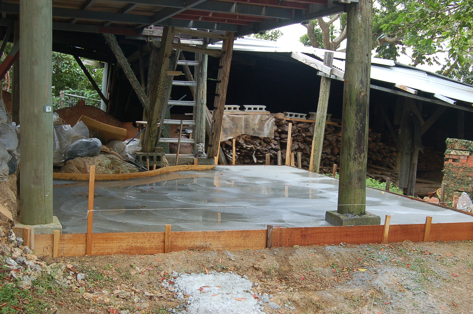 置かれていた電気窯をやちむん塾小屋のゲタの薪置き場を取っ払い急遽、設置場所に生コンを流して