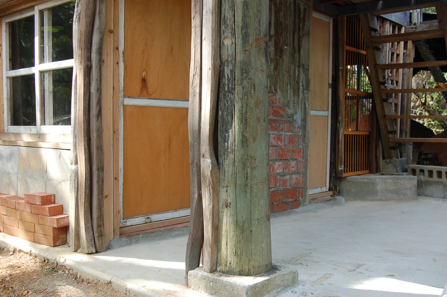 窯場を昼ごろに開けることにした。台風が続いたので戸をタスキ掛けにサン板を渡し、ドライバーでネジ留め閉めたままだ。