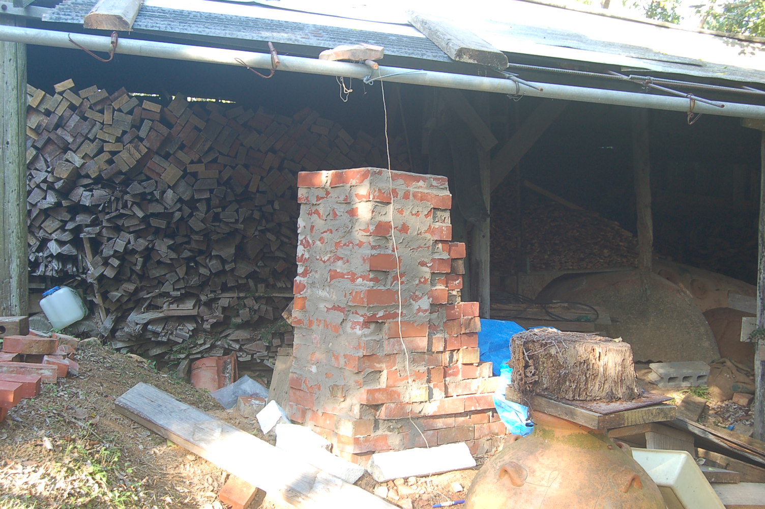 小窯の煙突もつみ終えて後は土で周りを補強するのみだ。今のところ窯場は維持管理が当面の仕事になっている。