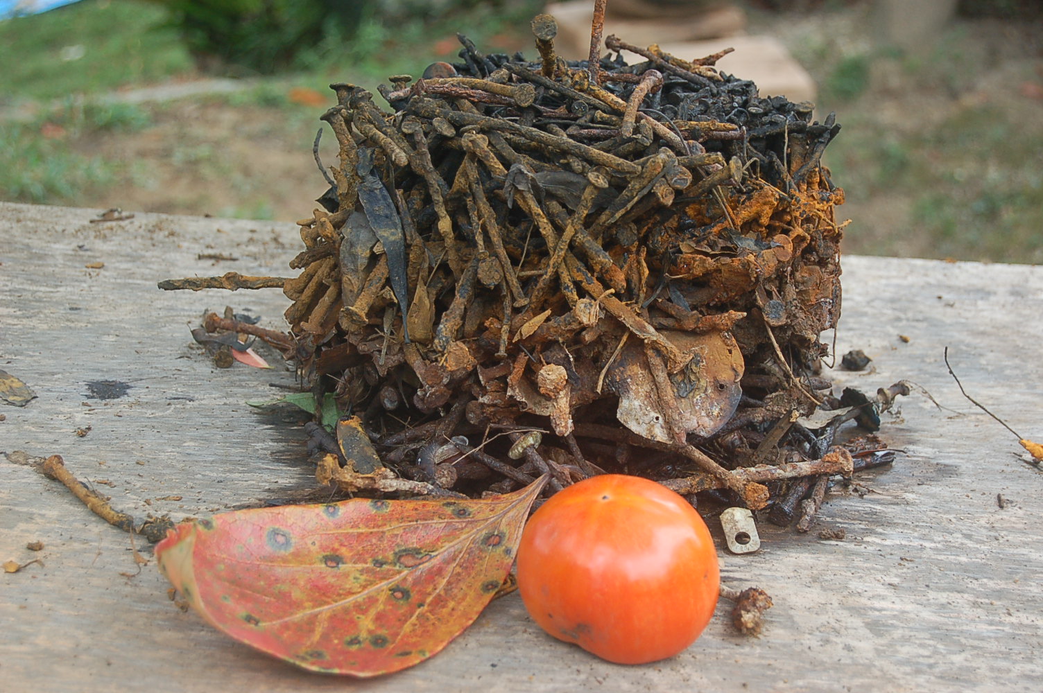 窯場の隅に桶に釘鉄を捨てていたものを、陶土を作るためにホサカ氏がひっくり返した錆びた釘の塊と柿。
