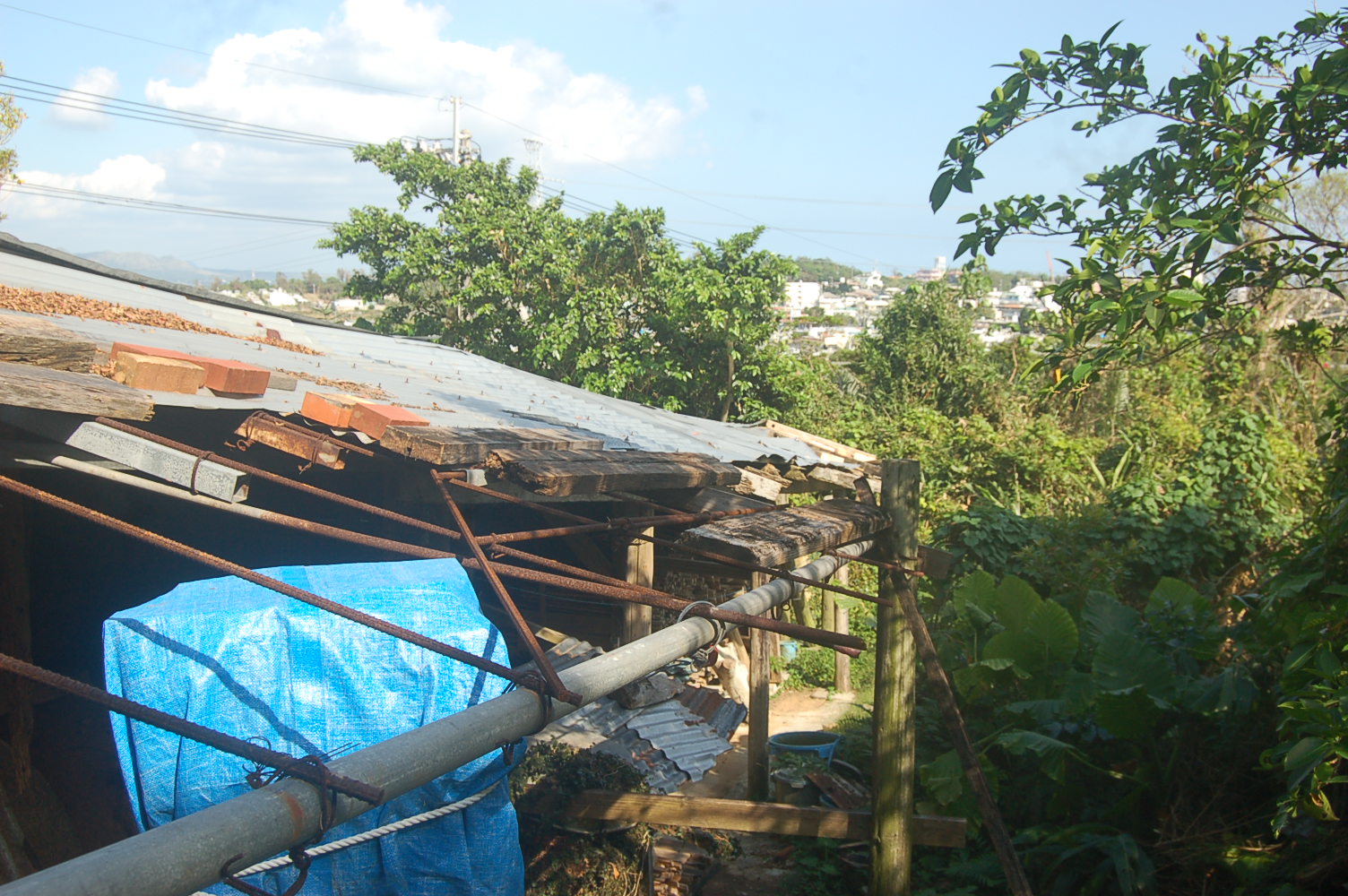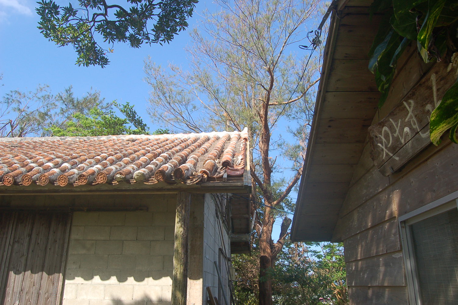 打ちのめされ脅威を感じる。小生窯場の建物被害は、これで3度目。同じ箇所に被害が出た。工房の北に突き出た赤瓦屋根軒の