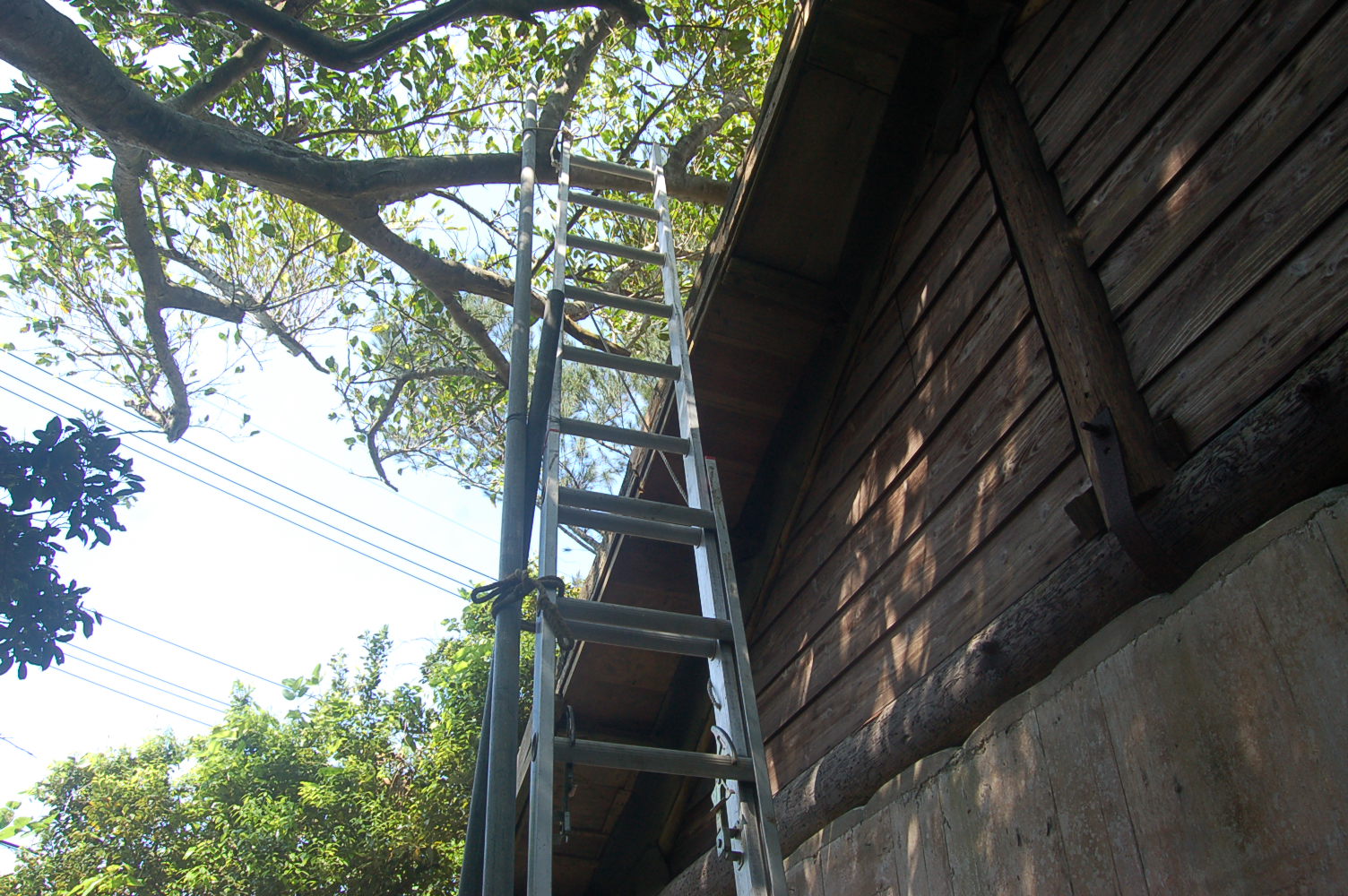 あわてて足場を壊す前にと、折りたたみ式の脚立を伸ばして足場に掛け上の箇所だけを紐で縛り残った補修を終えた。