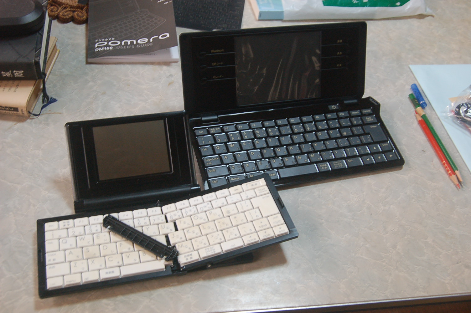 左壊れた折りたたみ式のキングジムのDM10と新しく購入したDM100こちらはキーボードは折りたたみではない。