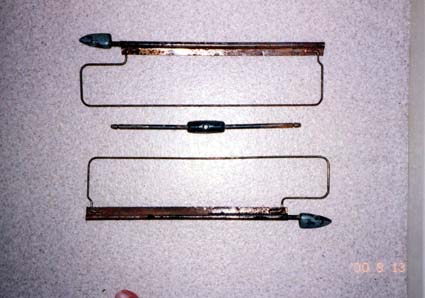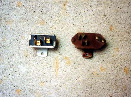 | 購入時より、燃料計と水温計の数値がおかしく、満タンにしても6分目位しか振れず、水温計に至ってはオーバーヒートしているのに、70度位を指していました。毎晩、車の整備書を見るのを日課としているが、ある日、ボルテージスタビライザーの文字を発見、しかも水温計のセンサーと燃料計のセンサーに繋がっているではないですか。値段を聞くと2、800円で在庫はあるとのこと。購入し交換。予想通り、針は正常な目盛りを指すようになる。 左が新品の物、右が以前から付いていた物。前から付いていた物は錆びだらけ。配線の接続するところが違う形状だったので、加工して付けた。脱着、交換に要した時間は10分であった。 |