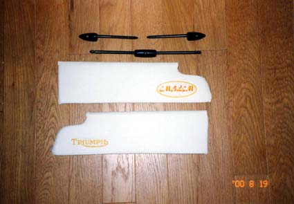 | この錆びた針金は何だ! 購入時にサンバイザーが付いていなかったので、欠品かと思っていたら、トランク中からこんな物が出てきました。どうやらサンバイザーの骨のようで、錆のため部品同士が固着していました。仕方がないので、タンクで使用する予定で購入した、マリンクリーンとメタルレディーで処理後、塗装をしてまるで新品のような針金を眺めてはにやにやしておりました。 |