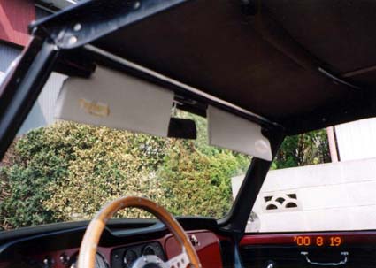 | 再生完了 左の写真が、自分なりに再生したサンバイザーです。元の形状も、作り方も知らないので、ハンズで適当にウレタンシートや安物のレザータイプの布を買ってきて手縫いしました。 写真で見るとなかなかの出来でしょう!近くではお見せできませんが、人に車を見せても言わなければ分かりません。 いつかは市販の物を購入したいと思っていますが、今の車のヤレ具合には丁度いいかも・・・ |