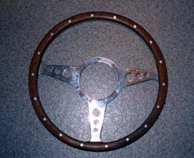 | ステアリング 購入時は、モトリタの13インチウッドが着いていました。 クリアの塗料が剥げて、みすぼらしい状態だったので、ステンで塗ってみました。 左が塗装前 |