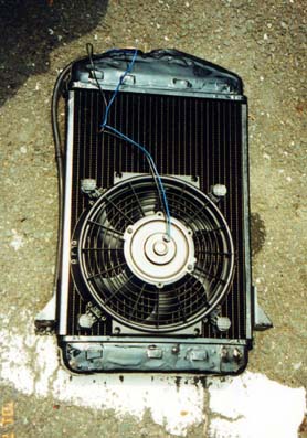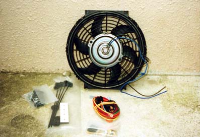 | ラジエターのコアを張り替えたので、冷却効率は上がっているはずですが、やはり停車時には随分水温が上がってしまい、ファンを取り付けることにしました。 HAYDENの10インチの物をサーモスイッチ付きで購入し装着。 |