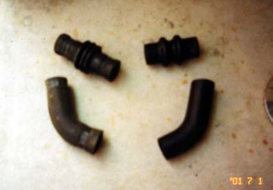 左下の写真 ピンぼ見にくいですが、左の2本が元々着いていたトップホースとボトムホース。 右側2本が新規に購入した物。 トップのホースが短くて、ギリギリの長さでした。 右側の2枚が、装着したときの写真。 フロントに着いているシュラウドもスプレーで黒く塗ってあげました。 |