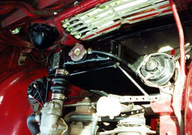 | ついこの間、脱着したばかりのラジエターを外し、取り付けた。位置は上部の方はシュラウドで空気が一番流れるところなので、下部に取り付ける。 写真で見て貰えば分かるが、コア部分はきれいだが、上下のタンクはでこぼこで、継ぎ接ぎだらけです。これもひとえに予算がない為。 いつか大容量のアルミラジエターでも特注で付けてあげたいですね。 |