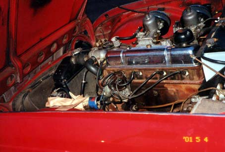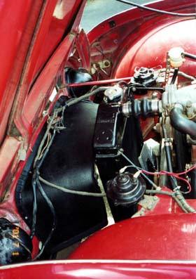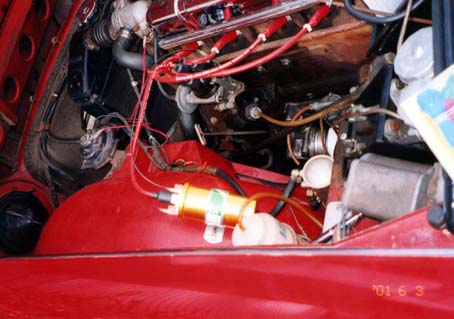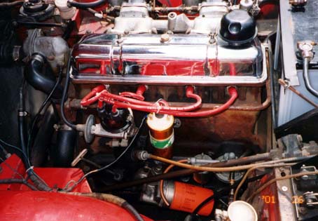 | 左上の写真が、初めての箱根ドライブ時に、熱対策のためにコイルを本来の設置場所であるエンジンブロックから移設した。取りあえずガムテープと針金で仮固定した。部材はspit1500さんが提供してくれました。 右上の写真は、自作のハイテンションコードとディスビキャップを取り付け、ローターとコンデンサーを交換、ポイントのギャップ調整を行ったときの写真。 この後、左の写真のようにコイルを熱対策のため、エンジンから離して固定した。 プラグコードは外皮はシリコンですが、心線がカーボンなので、抵抗値はまちまちです。 |