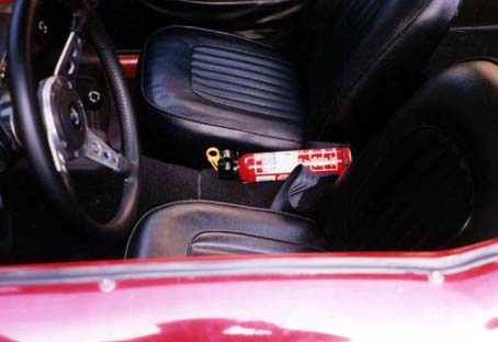 | 左前輪のピストン固着によるひきずりで、発熱し危うく火災になるところでした。 これも箱根の時にお会いした狛犬さんに貰った水をかけて事なきを得ました。 旧車は何があってもおかしくないので、今後の非常時に備え、消化器を購入しました。 ついでに、非常用三角板も購入しました。 「備えあれば憂いなし」です。 |