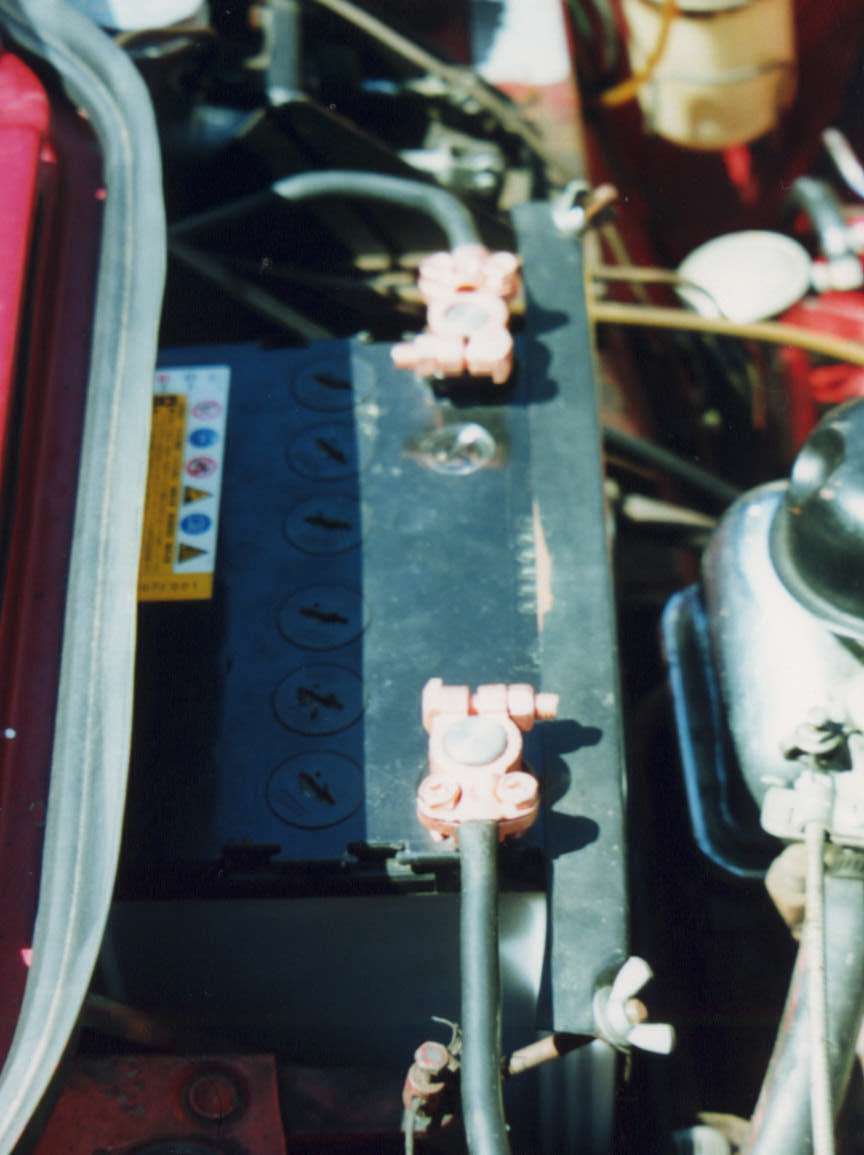 | 以前に付いていたバッテリー端子は、削れていて、締め込んでもすぐに緩んでしまった。 ホームセンターで市販されているものと交換した。 ケーブルは細い線材でを束ねてあるもので、ネジで締め込んだだけでは、ゆるゆるでした。 仕方がないので、半田で固めて太い棒状にして締め込みました。 ただ、半田ののりが悪く、かなりいい加減な仕事で、満足はしておりません。 次回は、ケーブルを交換したいと考えます。 |
