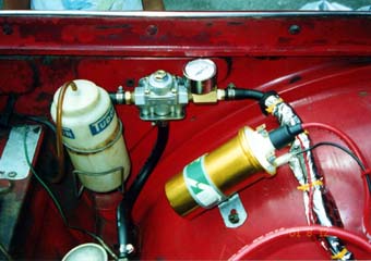 | これも判断が難しいところですが、ストールの一因がパーコレーションだけでなく、燃料の問題も有るのでは?と考えていました。特に高速走行時に追い越しをかけると、燃料がカットされたような状況になり、目で見て分かるような管理がしたいと思い、燃圧系とレギュレーターを付けました。 やはり、燃圧が思ったより低く、ポンプのイニシャル値から考えると、フューエルラインにも問題が有りそうです。 次回は、フューエルラインの交換とポンプのリアへの移設を予定。 |