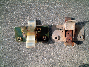 | 元々、かなりくたびれているので、きりがないのだが、ドアのチェックが腐っていて、ドアが風で煽られたりすると、壊れそうなので交換した。 右側が、元の腐ったドアチェック。左が交換したリプロ品。 ほとんどが中国製であり、これも例に洩れず、中国製。 その分、価格的にも高い物ではないので、助かるのですが・・・ |
