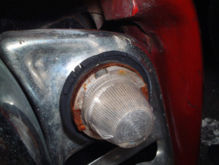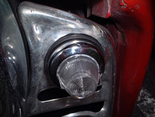 | 昨年の名古屋のライブでHishiさんから言われて気がついたのですが、左側のサイドランプのリムが取れていました。移動前には付いていたので、東名の走行中に取れてしまったのかもしれない。 | |