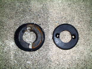 | ガスケットも右写真(左側)のように角質化してぼろぼろだったので、交換した。写真右側の物が新しいパーツ。 | |