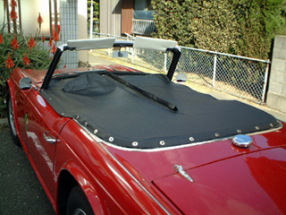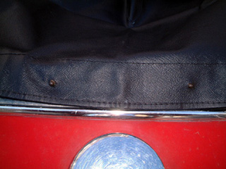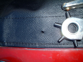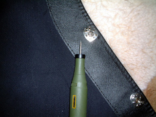 | 取りあえず、位置決めは現物あわせで、カバーを引っ張りながら行った。だいたいの位置が決まったら、穴を開けていった。たまたま女房が穴開け用の道具を持っていたので利用した。 取り付けようの説明書などはないので、段取りが全く解らないので、自分なりに考えて作業をした。 |