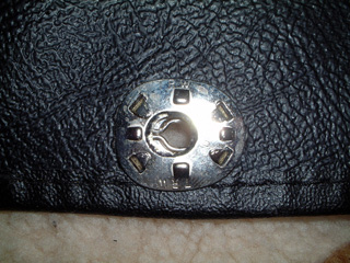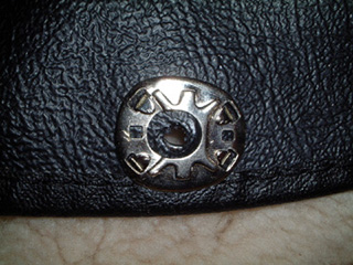 | 後ろ16カ所の金具ですが、センターに穴を開けて、4カ所の爪を内側に折り曲げて固定するようになっていました。4カ所の爪をする溝は、小さなマイナスドライバーをハンマーで叩いて開けました。合計64カ所。しかも全部現物あわせです。途中で何本もタバコを吸って休憩して・・・ また、取りあえず工具で穴を開けただけなので、金具全体の必要とする穴の大きさにほど遠い状態で、後で小さめのカッターで切り取ればよいと思っていたが、大間違いでした。 |