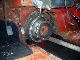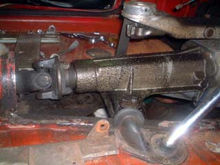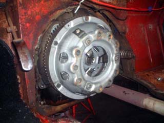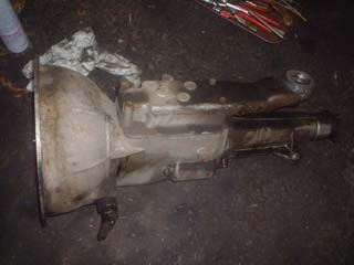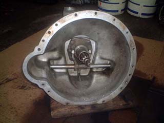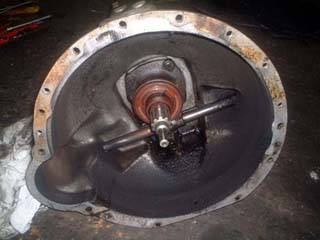 | どうにかカバーも外れ、ミッションが見えてきました。予想通り、ミッションのハウジングは油で汚れた状態になっていました。この後、エンジン側のボルト、補器類、プロペラシャフトの4本のボルトを外すと下記の写真のようにクラッチ部分が顔を見せてくれました。(奥のクラッチ部分が奇麗なオレンジ色に見えますが、錆びてそのように見えている。)写真では簡単に外れたように見えますが、相当苦労して分解しております。当然、私は作業の邪魔にならないようにツナギを着たまま見つめているだけの状態です。 | |||