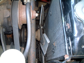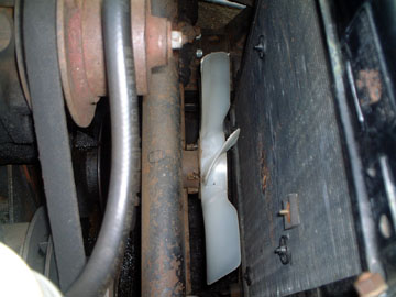 上が外したファン。如何にも重くて、バランスが悪そうです。 下写真 本来はラジエターを外してから、作業をするべきと思ったが、そうするとラジエター液も抜かなくてはならないので、手抜きをした。 おかげで、コアと自分の腕を傷つけてしまった。 |
