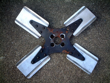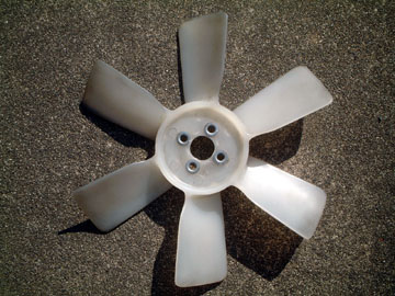| 上写真 オリジナルのラジエターファンはスチール製の4枚羽根です。吸い込みの効率も悪く、バランスまで悪い。いつか交換しようと考えていました。国産(ジムニー用)のファンが手に入ったので、加工して取り付けた。 下写真 ちょっと小ぶりだが、6枚羽根で効率よさそうなファン。当然、穴位置等は合わないので、ドリルで穴を開け直して無理矢理に取り付けた。 |
