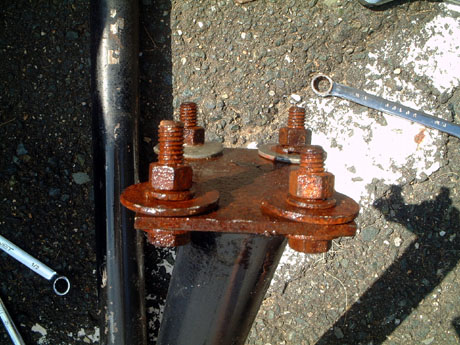 | 特にひどかったのはベース部分でした。サビで固着していて、16本のボルトを外すのに体力を消耗してしまいました。 ボルト、ナット、ワッシャー等は全て新品に交換し、元の部品は廃棄処分に・・・ |