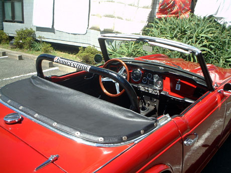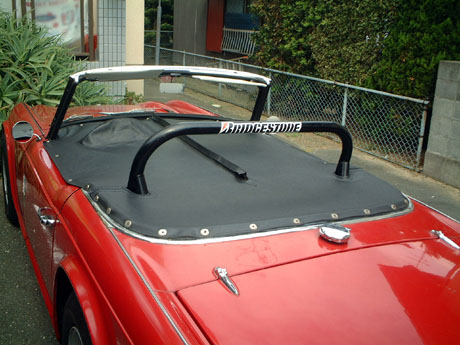 | 取り付けに際しては、ロールバーの精度とボディーの精度の悪さからか、左右の取り付け位置、左右の高さの不具合が発生し、穴位置や高さ調整のためのワッシャー噛まし等の作業が必要となってしまいました。 写真のように、以前のトノカバーが使用できなくなりましたので、近い内にトノカバーの改造が必要になってしまいました。おそらく、ロールバーの購入価格よりこちらの方が高くつきそうです。 しかし、こうなってくるとバンパーレスにした方が似合うかもね。 |