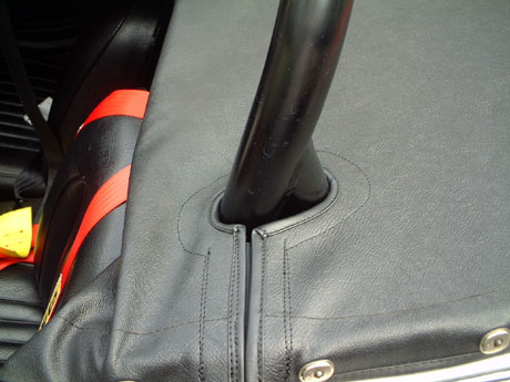 | どのように加工するか悩んだのですが、単純に切り込みを入れて、バーの部分を切り取り、切ったところはマジックテープで固定する方法を採りました。 加工代は安くやって貰ったので、ロールバーよりかかりませんでした。 |