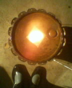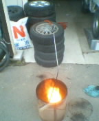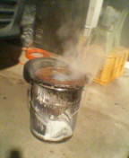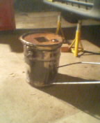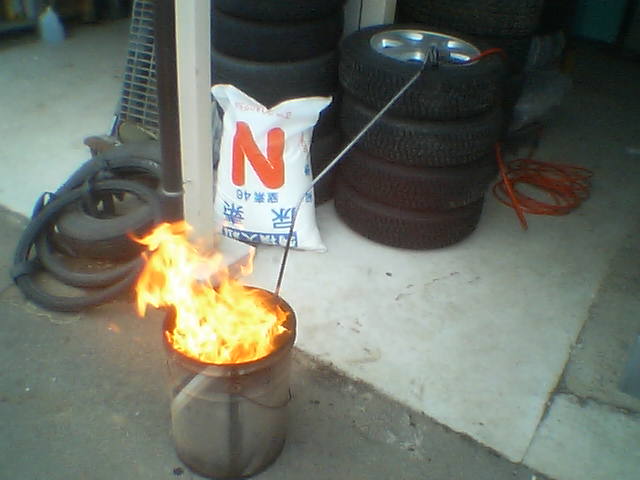 とりあえず廃油を燃やしてみる!ペール缶にコップ1杯ほどの廃油を流して点火、