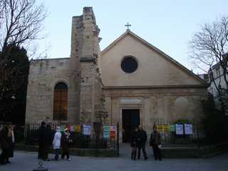 -期末テストを受けた試験場も残っています。・・・ ともかくも街中の小さな公園の裏に出た。そこには古風な教会がうずくまっていた。 山砦のように素朴に石積みされた壁をもつ建物で、外観に装飾的な彫刻などはない。 ザヴィエルの当時、この教会は、サン・ジュルエル・ル・ヴーウルを呼ばれていて・・・ 「街道をゆく22 南蛮のみちT」司馬遼太郎著 教会はかろうじて、ガイドブックの地図の上に名前だけ載っていて、地図と道を交互に見ながら、夕暮れのパリ、カルチェラタンを歩く。 大きな通りには若者があふれているが、少し路地に入ると人は少ない。突然、古ぼけた一角があり、表に回るとその教会だった。 中ではミサをおこなっているようであったが、入れてはくれなかった。 |