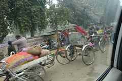 朝5時に駅には行ったものの列車は朝霧のせいでとろとろとアグラに向かっていきます。一等列車はの乗客は慣れているのか、誰ひとり怒ることもなく、思い思いに時間を過ごしています。この霧が晴れないとタージ・マハルは見えないだろうと半ば諦めていましたが、2時間遅れで駅に着いたころには青空が見え、運転手さんにラッキーボーイ称号をいただきました。