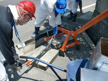 オレンジ色の機械は、今日初めて使う 「どぶ太郎」 てこの力を使って、開き難い側溝の蓋を持ち上げようというものです。 どうやら、先に派遣された電機連合がいわき市に強く要望し、買って貰ったもののようです。 力が強い分、持ち運びやら、設置に手間が掛かるのがちょっと難。