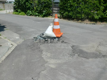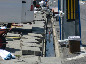 この辺り、地盤が30cmほど下がったようで、マンホールの蓋がこんなに持ち上がっています。 折角、側溝の砂を取り除いても、場所によっては巧く流れてくれません。 本格的な復興にはまだまだ時間が掛かるようです。