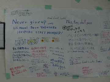 参加者の寄せ書きがいたるところに。 米軍横須賀基地の医療チームのそれもあります。