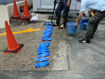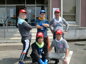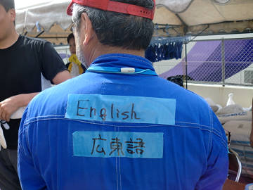 ひげの今日の作業はボランティアセンターで、ボランティアに参加して下さる方々に、その作業に応じた機具を貸し出す係り。 センターに詰めるということで、何かの役に立てばと背中に 「English」 「広東語」 を貼り付けて 「コミュニケーションを図れるよ!」 とアピール。
