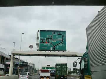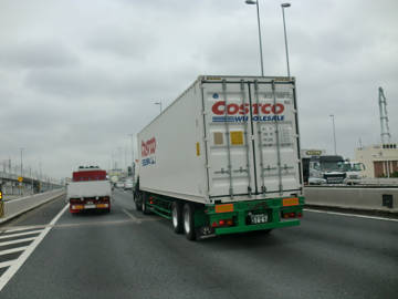 予告通り、浦安に入ると渋滞の最後尾。 ここから大井出口までずっと渋滞が続きます。 三車線の一番左を走りますが、途中、追い越し車線が早く流れたり、左端の車線が早く流れたりと多少の変化はありますが、大井出口近くに着く頃になっても結局、廻りの車は殆ど同じ。 COSTCO のコンテナとも、何度も追い抜き、追い抜かれ。
