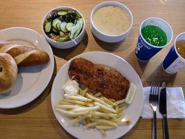 1時過ぎに病院を出て帰路に着きますが、今日も真っ直ぐは帰りません。 そう、寄り道する先は船橋の IKEA 。 高さの制限があり、立体駐車場には入れませんので、トラックヤードの隅に駐車させて貰います。 店内に入ると、先ず、腹ごしらえ。 Fish & Chips、 Salad & Soup set.。