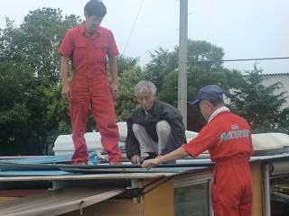 少し肌寒い位の気温、加えて小雨が降ったりやんだり。 そんな中、屋根に昇る三銃士。 いや、熟年三人組み。