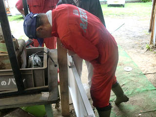 拡張工事を終えた作業小屋にトタン屋根を打ち付けているところ。