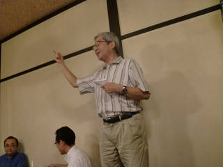 で、いよいよ主賓の挨拶。 「行った国、24カ国。 一番良かった国、オーストリア、一番面白かった国、イギリス などなど。」